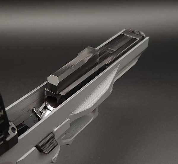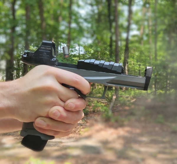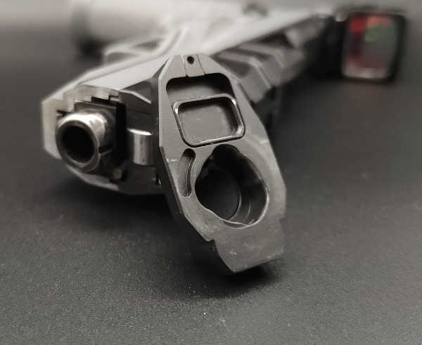 Rideout Arsenal designed the Dragon from the ground up to be the fastest follow up shot competition pistol on the market. We've done this by addressing the primary delay between shots, reaquiring a sight picture. All traditional hand guns place the barrel bore axis well above the shooters hand. This results in muzzle flip as recoil forces impart a twisting torque on shooters grip. The shooter then needs to push the barrel back down on target and line up the sight on target. Moving the bore inline with the web of the shooters hand essentially eliminates recoil induced muzzle rise. The smooth operating lever delayed blowback operating system gently applies recoil forces to the shooter resulting in a very flat and controllable shooting experience.