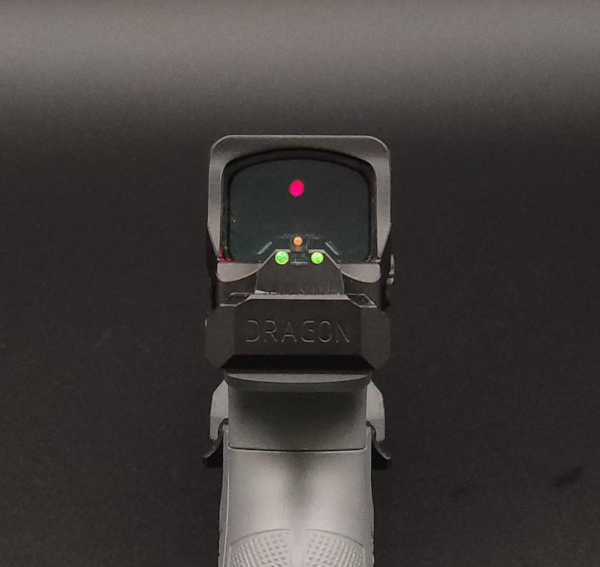 Back up co-witnessed (1/4 height) fiber optic sights are built into the Dragon. The front sight is mounted into the nose and stays fixed during shooting. The windage adjustable rear sight is mounted behind the optic on the N-ROC providing an extremely solid sight picture.