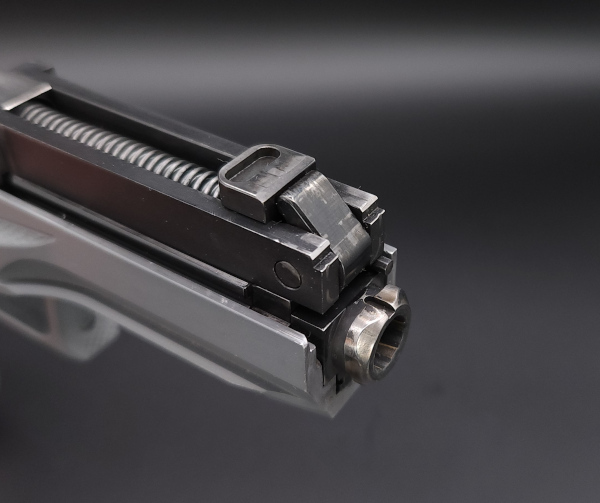 The nose directly attatches to the fixed barrel via a quick detatch tri-lug interface. This allows rapid and tool-less swaps to accomadate accessories such as silencers, front sight variants, and tunable weight modules.
